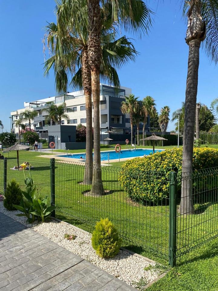 La vivienda consta de hall de entrada, distribuidor, tres dormitorios, dos baños completos, salón-comedor, cocina y una amplia terraza cerrada con cristales plegables, que nos permite excelentes vistas con orientación suroeste, y por lo tanto, muy soleado. Se accede a esta terraza desde la cocina y el salón. La Urbanización es muy tranquila, y la mayoría de los pisos son segundas residencias de sus propietarios.